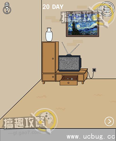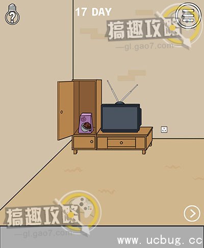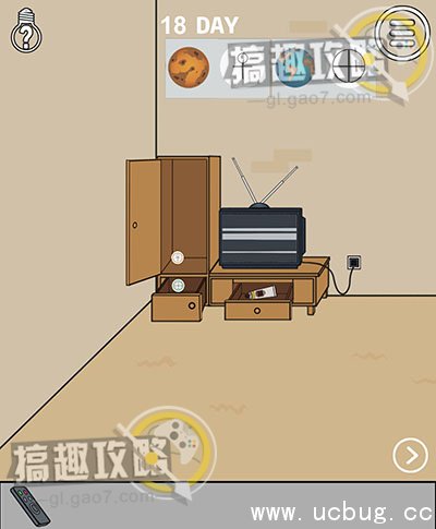 右边打开柜子拿到叉子,用叉子拿到柜子下面的遥控器。