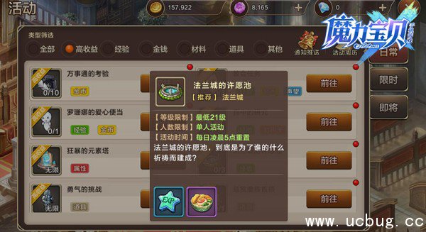 当勇者们到达21级,点开活动面板,就能在高收益活动内找到法兰城的许愿池。点击前往即可直接传送到位于法兰城正中的许愿池。许愿池边的少女芙格会指导各位勇者如何在许愿池进行许愿。