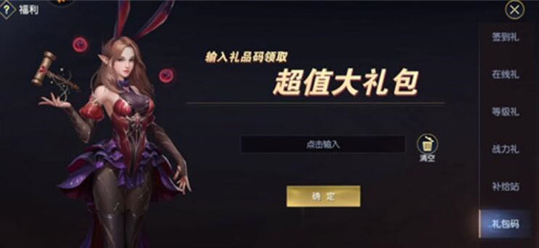 3、接着屏幕中间会出现一个输入框,我们输入自己得到的礼包码,然后点击下方的确定即可将礼包领取了。