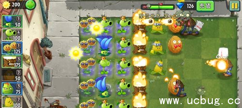 然后是豌豆射手+火炬树桩,玩家们也可以尽可能选择多的豌豆射手,再搭配上一行的火炬树桩,攻击力增强。还有前排记得配合上玉米投手,能够延缓僵尸进攻速度。
