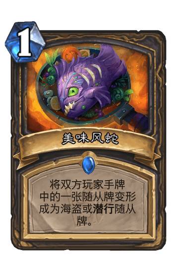 美味风蛇其实是变异鱼汤,跟风蛇没有关系,最开始是因为翻译问题,后来变成了一个梗就保留了下来,魔兽怀旧服里吃了美味风蛇就可以变成黑衣忍者或者海盗,设计师算是把这一风味完美保留并复刻到炉石卡牌上了吧。