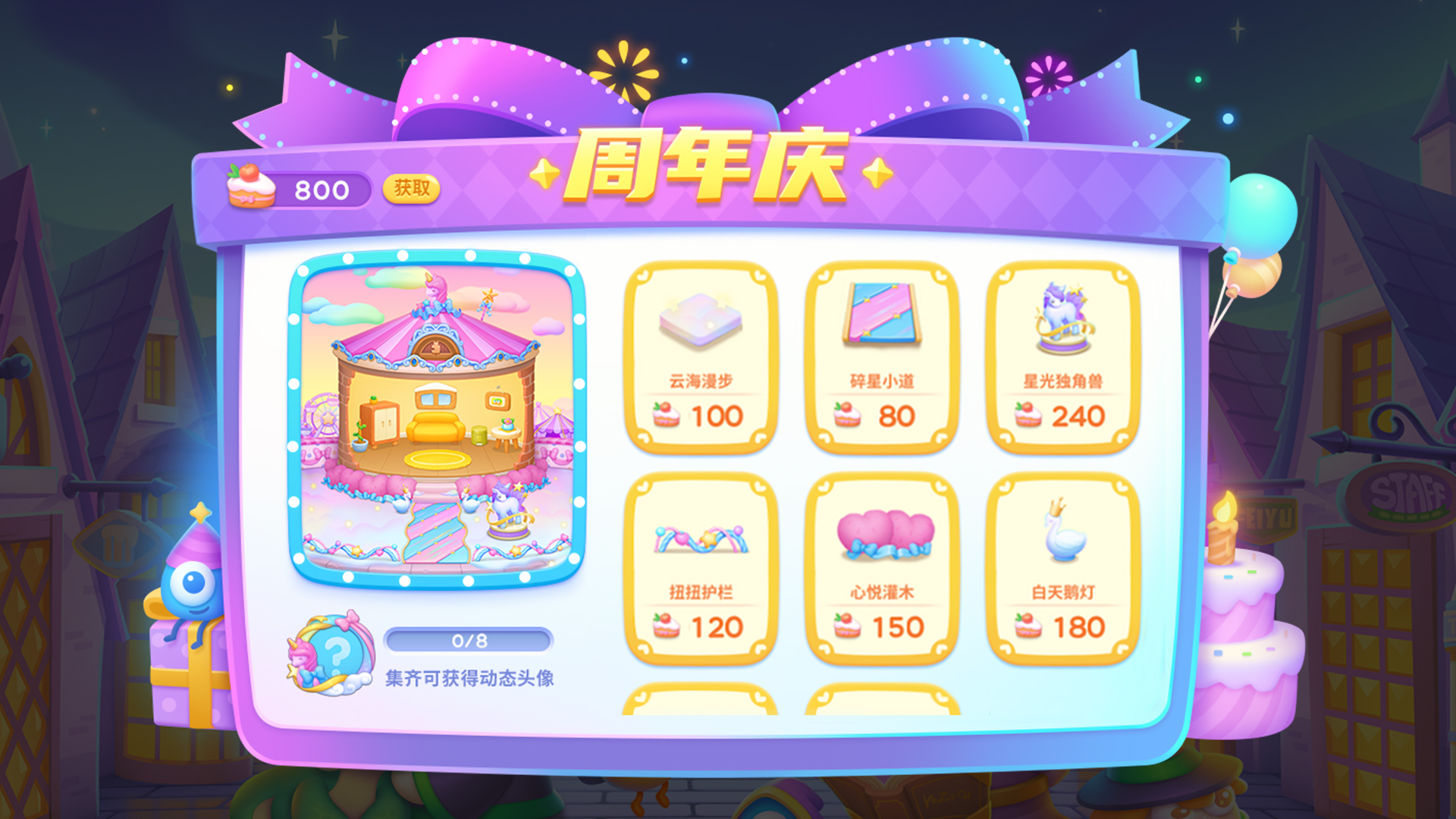 参与「周年庆」限时活动,获取限定「梦幻城堡」主题室外装扮!渐变云朵交织在天际,给阿波公寓带来了无尽的浪漫!护栏、地板、道路都被装扮成梦幻的粉紫色,让人仿佛置身于童话般的世界。