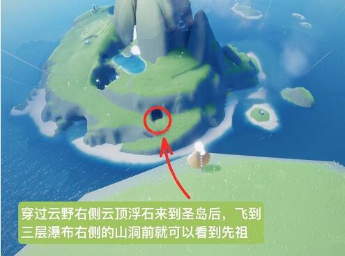 1、穿过云野右侧云顶浮石来到圣岛后,飞到三层瀑布右侧的山洞前就可以看到先祖了。