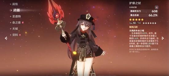 1、护摩之杖:作为胡桃的专武,契合度第一没有问题,而且作为实打实加面板的武器,使用起来基本没有限制,50%血量限制带来的二次增强对其他角色来说略微尴尬,但对胡桃来说就不是问题了。2.匣里灭辰 仅次于护摩之杖的最契合武器。与魈不同,胡桃很缺增伤区,46.6%的火伤杯,33%的半血火伤,并不能达到120%的增伤阈值(物理系150%,元素系120%)。