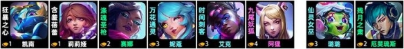 凯南、莉莉娅、赛娜、妮蔻、艾克、阿狸+璐璐和阿卡丽/奇亚娜
