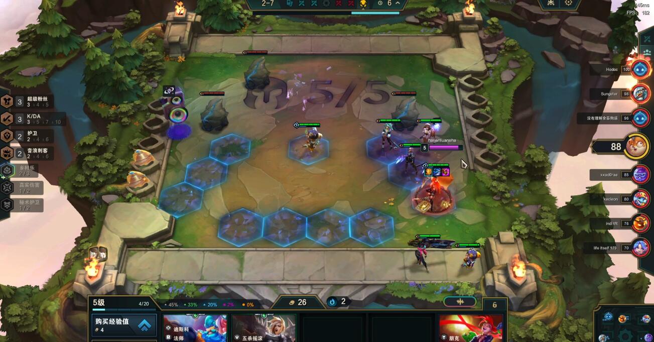 开局质量高:2-1拉4,2-5拉5,用赛季之星凯南、莉莉娅、金克丝等搭配超级粉丝过渡