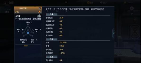 这款武器就是冲着情人节去的,武器的设计也颇为巧妙。整个武器的颜色就是粉粉嫩嫩的,枪口处为一支大号的口红,枪械的弹夹改到了武器的顶部,弹夹内装的是一堆糖果,枪械尾部还有粉红色爱心礼盒与蝴蝶结装饰。