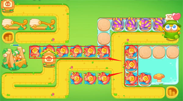 2、等水中的浮板多了,我们继续放置鞭炮,然后开始向左边清理道具,并且放置鞭炮增加还伤害。