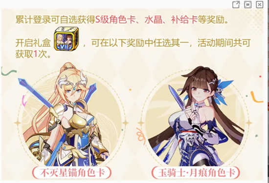 3、累计登录获得自选S级角色卡资格,还有水晶、补给卡等你来领。