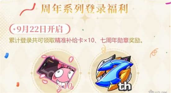 1、9月22日起登录游戏可获得精准补给卡和七周年勋章奖励。