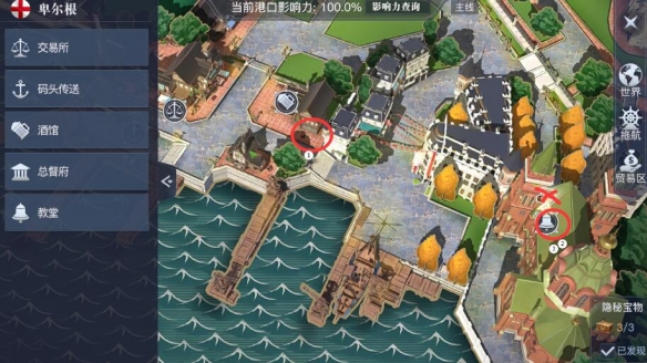 黎明之海的卑尔根隐秘宝物一共有3个,大概位置查看下面地图显示。地图显示有BUG,①号宝物实际上在酒馆外面,②和③号宝物都在教堂里面,地图上箱子的位置是错误的。