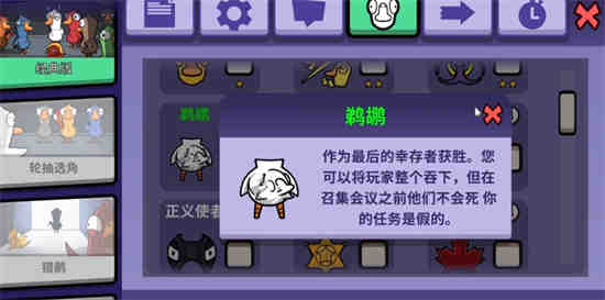 1、鹅个职业技能:作为最后的幸存者获胜,你可以一口吃掉别的玩家,被吃掉的玩家在你肚子里可以说话,但是只有你能听见,别人听不见,吞人无上限,被吃玩家可以在你的肚子里交流。
