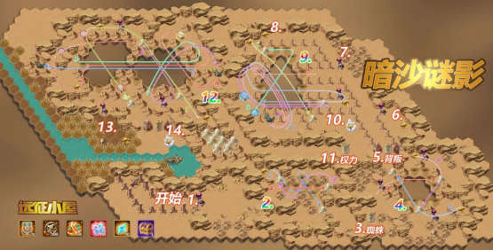 1、剑与远征暗沙谜影奇境探险通关路线如上图,这次奇境流程比较长,按照数字顺序即可过关。