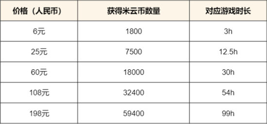 【米云币】:用于抵扣《云·原神》游玩时长,可通过购买获得。购买后可在信息界面及用户中心查看当前账户中米云币的余额。米云币有以下5个充值档位: