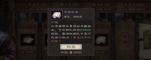 军略道具。可以用战功换取军略详述和军略孤本提升武将等级,经验由队伍中所有武将平分。如果只想提升某一武将的等级,就在队伍里只上阵这一个武将。一般用军略详述和军略孤本将等级提升到32级就好,再用的话性价比不高,不如直接让队伍扫荡高级地。