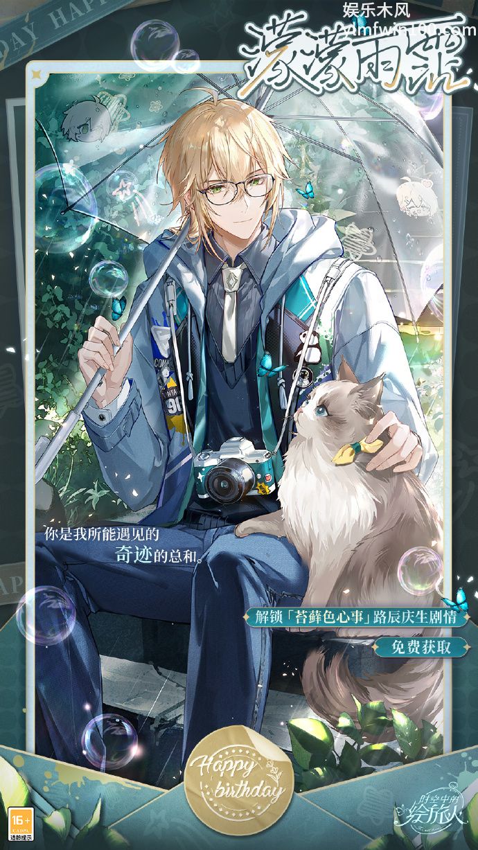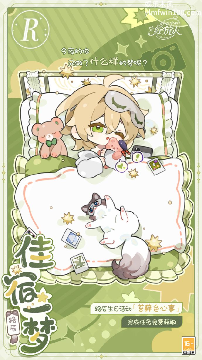 3月15日09:30 - 3月24日05:00,参与路辰生日活动「苔藓色心事」,可免费获得1张生日纪念画灵[濛濛雨霑]、生日Q版画灵[佳宿一梦]及生日情侣头像等奖励。