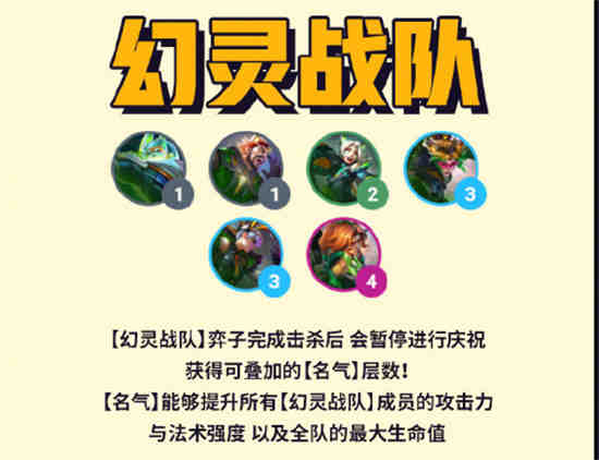 [幻灵战队]弈子完成击杀后会暂停进行庆祝获得可叠加的[名气]层数[名气]能够提升所有[幻灵战队]成员的攻击力与法术强度以及全队的最大生命值