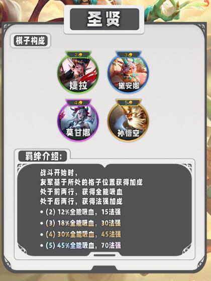 战斗开始时,友军基于所处的格子位置获得加成,处于前两行,获得全能吸血,处于后两行,获得法强加成。