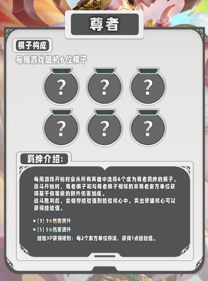 每局游戏开始时会从所有英雄中选择6个成为尊者羁绊的棋子。战斗开始时,尊者棋子和与尊者棋子相邻的非尊者友方单位获得基于你等级的额外伤害加成。战斗胜利后,会储存经验值到经验核心中。卖出灵魂核心可以获得经验值。