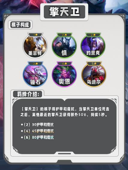 擎天卫的棋子得护甲和魔抗,当擎天卫单位死去之后,离他最近的擎天卫获得额外50%,持续5秒。