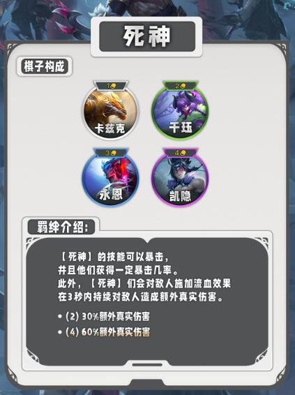 死神的技能可以暴击,并且他们获得-定暴击几率。此外,死神们会对敌人施加流血效果,在3秒内持续对敌人造成额外真实伤害。