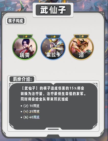 武仙子的棋子造成伤害的15%将会转换为治疗量,治疗最低生命值的友军。同时将会给全队带来双抗加成。