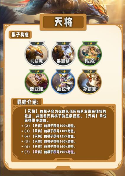 天将的棋子会为你的队伍所有队友带来独特的收益,并随着天将棋子的星级提高。天将单位获得更多增益。