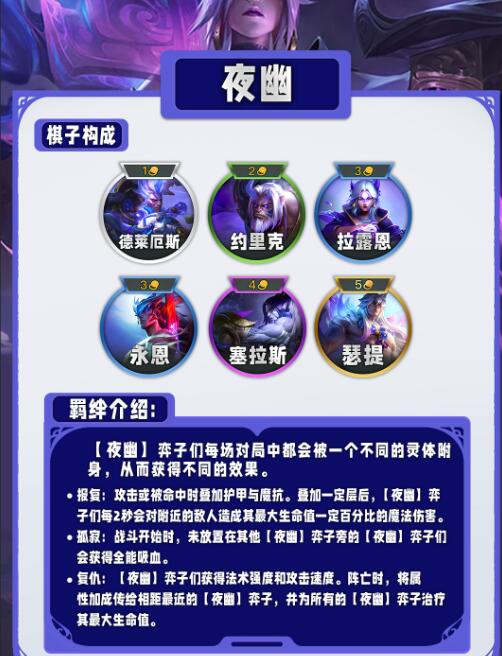 报复:攻击或被命中时叠加护甲与魔抗。叠加一定层后,夜幽弈子们每2秒会对附近的敌人造成其最大生命值一定百分比的魔法仿害。