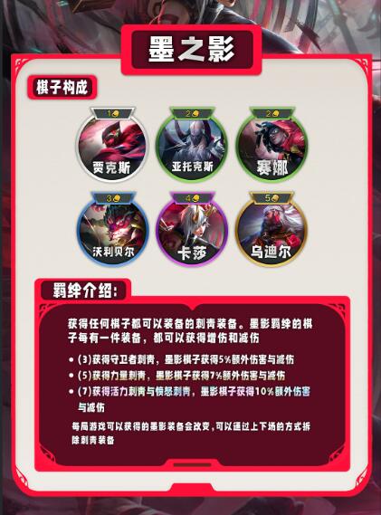 获得任何棋子都可以装备的刺青装备。墨影羁绊的棋子每有一件装备,都可以获得增伤和减伤。