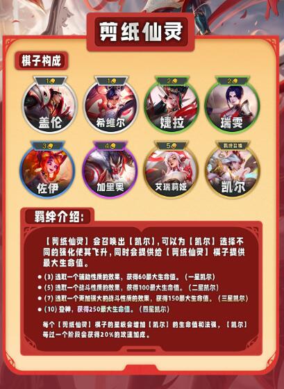 剪纸仙灵会召唤出凯尔,可以为凯尔选择不同的强化使其飞升,同时会提供给剪纸仙灵棋子提供最大生命值。