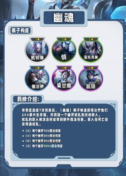 承受或造成7次伤害后,幽魂棋子快速获得治疗他们20%最大生命值,井派遣-个曲灵扰乱附近的敌人。扰乱的敌人被攻击时会受到额外魔法伤害。敌人在死亡后会传递扰乱。