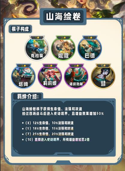 山海绘卷棋子获得生命值、法强和攻速,经过四场战斗后进入史诗境界,且增益效果增加50%。