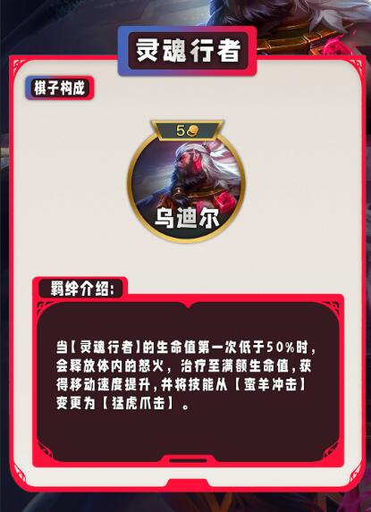 当灵魂行者的生命值第一次低于50%时,会释放体内的怒火,治疗至满额生命值,获得移动速度提升,并将技能从蛮羊冲击变更为猛虎爪击。