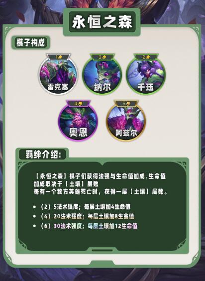 永恒之森棋子们获得法强与生命值加成,生命值加成取决于土壤层数。每有一个敌方英雄死亡时,获得一层土壤层数。