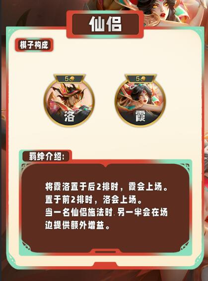 将霞洛置于后2排时,霞会上场。置于前2排时,洛会上场。当一名仙侣施法时,另一半会在场边提供额外增益。