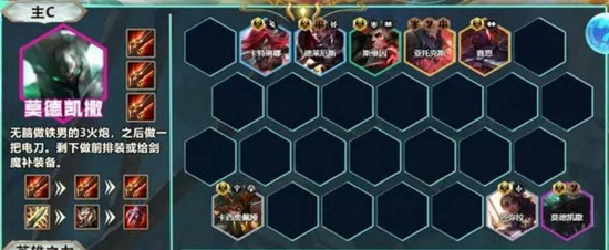 3、铁男作为阵容主C装备无脑给火炮即可,然后再给一把电刀,剩余的装备给前排或者给剑魔都可以。