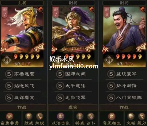 1.在战法搭配上,SP袁绍以控制型主动战法为主,威谋、卧薪、横扫、掣刀甚至A级战法落凤和纵兵也常常在线。SP朱儁以补充输出为主,焰逐、焚营、无当、太平都可以。沮授作为辅助将,上八门金锁阵、暂避、刮骨等,以减伤恢复为主,可谓各有分工又配合紧密,系统性很强。