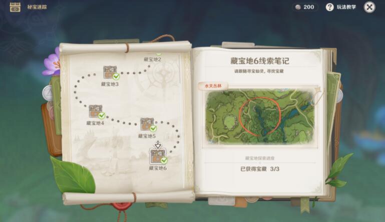 原神3.0秘宝迷踪第六天怎么完成?今天是3.0版本秘宝迷踪的第六天,也是该活动的最后一关,所以在完成今天的任务内容过后,我们便能够将一份仙灵以及兑换商城中其它的摩拉,培养材料,原石啥的兑换完全了,这一次各位旅行者都选择了什么颜色的仙灵呢?回归正题,这一次的寻宝点选择在了我们须弥的水天丛林地图板块中,和之前一样,今天小编也是将所有的藏宝点,能量点的位置进行了一份攻略,一起来跟着最佳路线,快速的完成吧~