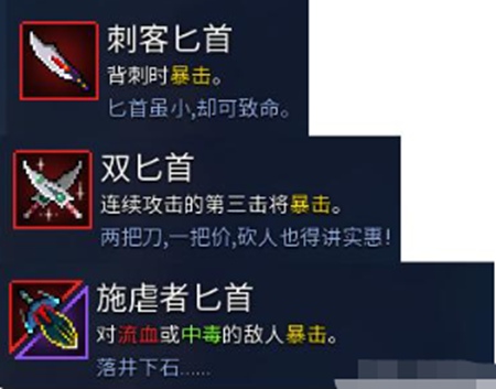 匕首类武器,起手快,动作短。刺客匕首配合全程无敌的翻滚和技能“位移”瞬移至敌人身后可以打出相当安全且高效的连杀。双匕首前两击虽然没有暴击,但是可以稳定敲晕很多前期小怪,第三下收走人头。施虐者匕首则可以配合红流变异“开放性伤口”(攻击使敌人流血)或者自己在铁匠处刷出“使敌人中毒”的词缀。这三类武器面板伤害不高但是暴击倍率明显比其他武器高一截。要说缺点嘛,刺客匕首稀有,双匕首生存能力不如另外两者,施虐者匕首暴击要求略苛刻——武器词缀难刷,变异图纸难掉。