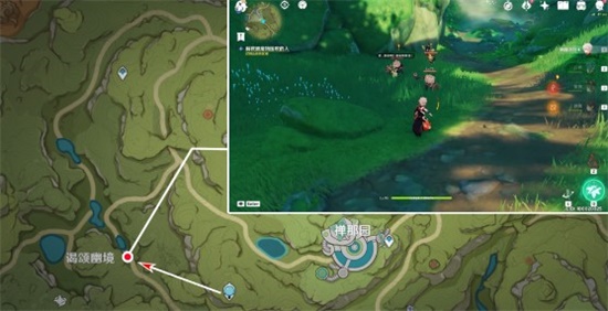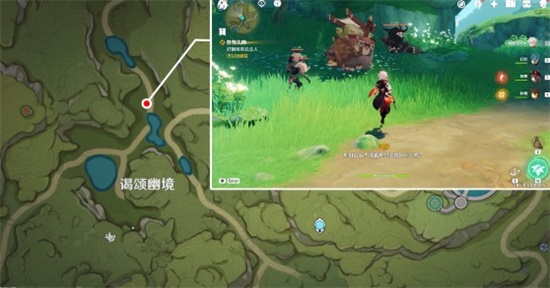 在下图所示位置,我们遇到一个被丘丘人围攻的人,看样子他解决不了眼下的麻烦,我们还是快去帮帮他吧。