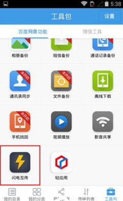 1、两台手机同时登录百度网盘,在工具包中点击“闪电互传”菜单;