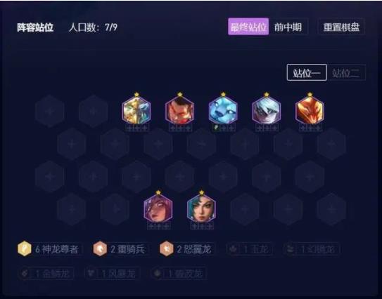 搭配的羁绊有:6神龙尊者、2重骑兵、2怒翼龙,如果上八人口,可以将卡尔玛换成亚索,然后再上一个重骑兵。