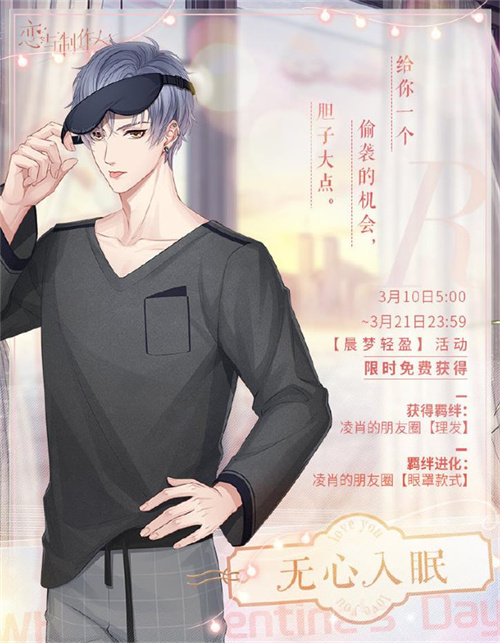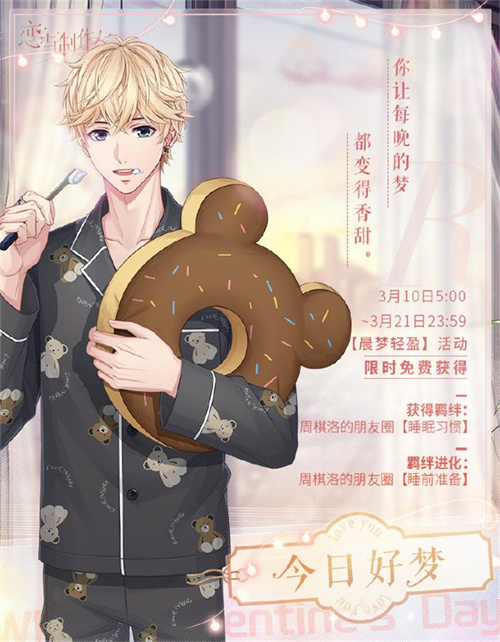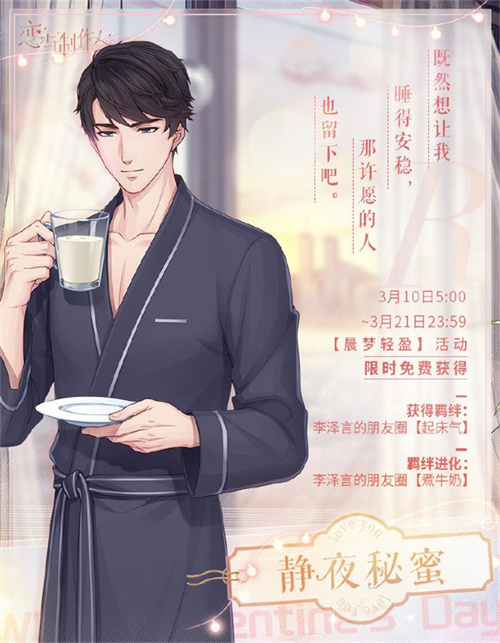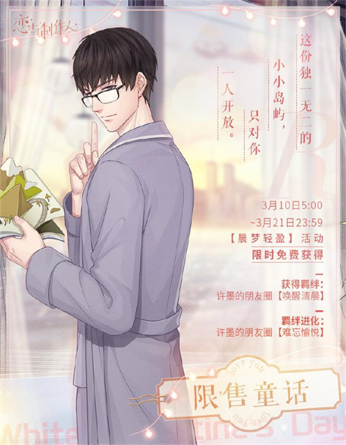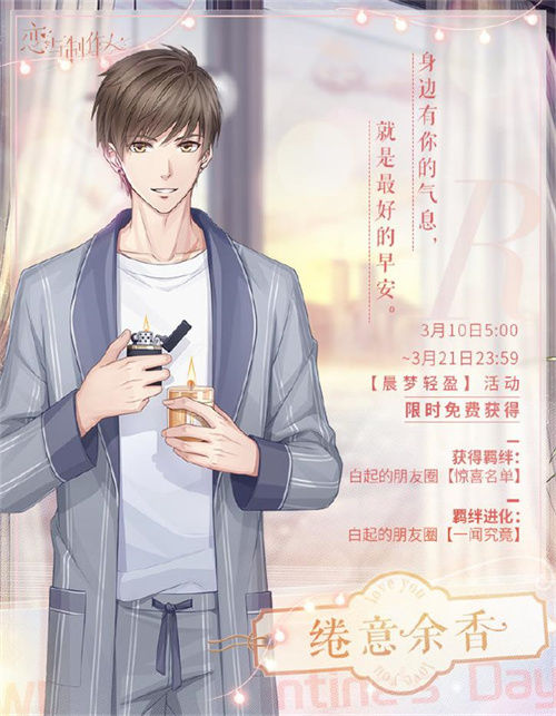 超人气恋爱游戏《恋与制作人》于今日(10号)开启白色情人节主题版本,参与「晨梦轻盈」活动可免费获取2022白色情人节主题R羁绊,除了窗帘缝隙中撒入的阳光,还有他轻轻落在额头的吻唤醒朦胧清晨。此外,「言和岁丰」限时拍摄副本也将同步开启,参与活动获取李泽言限定SR、R羁绊,更多精彩内容期待制作人前往游戏探索体验。