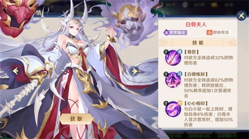 阎君相比白骨夫人更适合持久战,放后排【双方任意阵亡1人,增加5%攻击,回血12%】,适合搭配毒、回血、减怒其他神将来增强整体作战能力。