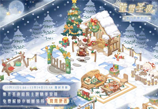 12月23日5:00—12月29日23:59,在小屋愿之庭的限时抽奖阁“莹雪圣夜”许愿,可获得圣夜庭院主题家具!集齐所有限定家具还可领取全新小暖暖装扮“茸茸使者”!