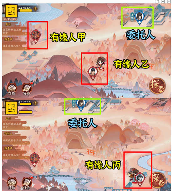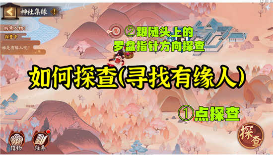 1、进入活动(点庭院小黑猫猫进入)后,点击探查,然后跟随头顶罗盘指针所指方向,寻找有缘人。