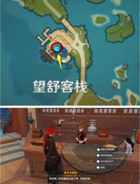 在望舒客栈内可以找到老板菲尔戈黛特,菲尔戈黛特出售:杏仁豆腐、松茸酿肉卷、野菇鸡肉串。均为食品。