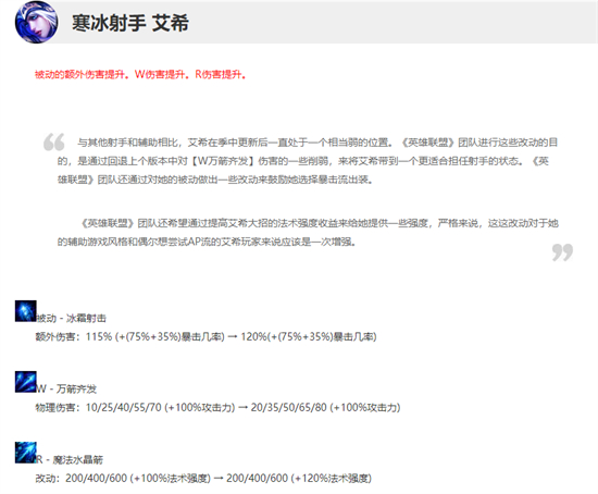 艾希这波增强,算是相当到位了,设计师难得提升了被动的伤害倍率,直接来到了120%,W技能的伤害也有所回调,如果只是艾希的增强,那必然是不够的,最近设计师对下路进行了多轮的削弱,大核AD不再强势,像是艾希这种偏打线的AD,就有了发挥的空间。