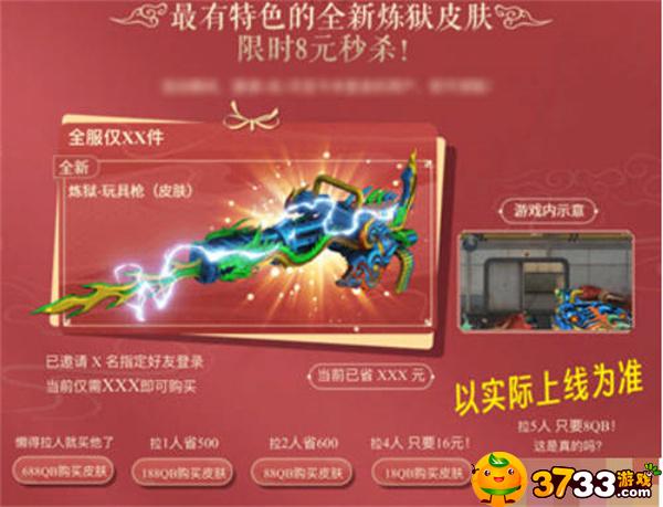 同时还有八元秒杀的活动,炼狱玩具枪皮肤邀请五人就可以用八块的价格拿下这个皮肤,但是邀请人的任务还是比较难做的。