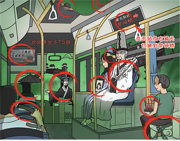 2. 首先,点击右边的显示牌箭头三次,切换到【奈何桥】。注意观察女生头上是否戴着【蝴蝶结】,手里是否捧着【黑白照】,右下角的乘客是否拿着【三长两短】,左下角的人是否拿着【方向盘】,前面的人是否在【打伞】。此外,屏幕上是否播放着【车祸新闻】,车顶上是否有【小鬼】,还有是否出现了【红色月亮】。